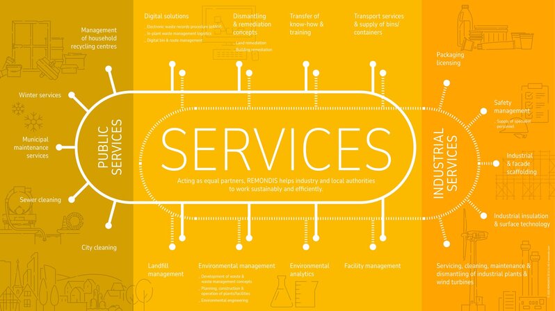 • No matter what technology or service we develop within the Group or what experience we may gather, we always make it available to others. The result is a full and complete range of services that have been adapted to meet the exact requirements of our customers and that deliberately unite sustainable development, environmental protection, cost savings and resource conservation. Whilst our services have, in principle, been divided up into two groups – industrial services for companies and public services for local authorities and/or their residents – they often overlap. Some of our services can benefit two or even all three target groups.